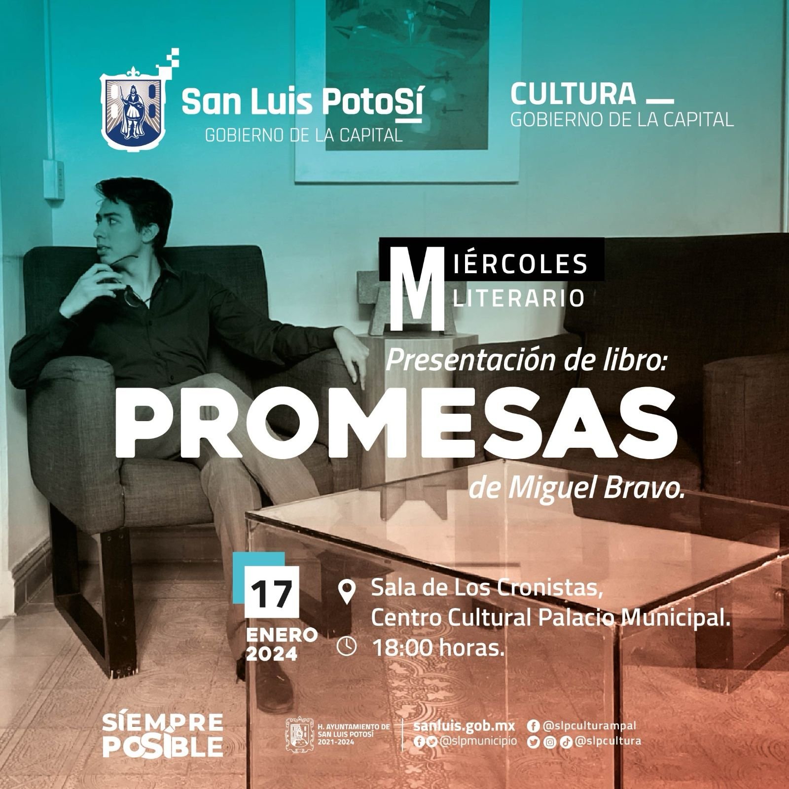 - Se presenta el libro Promesas este próximo miércoles 17 de enero del 2024 a las 18 horas, en el Centro Cultural Palacio Municipal, del autor Miguel Bravo.