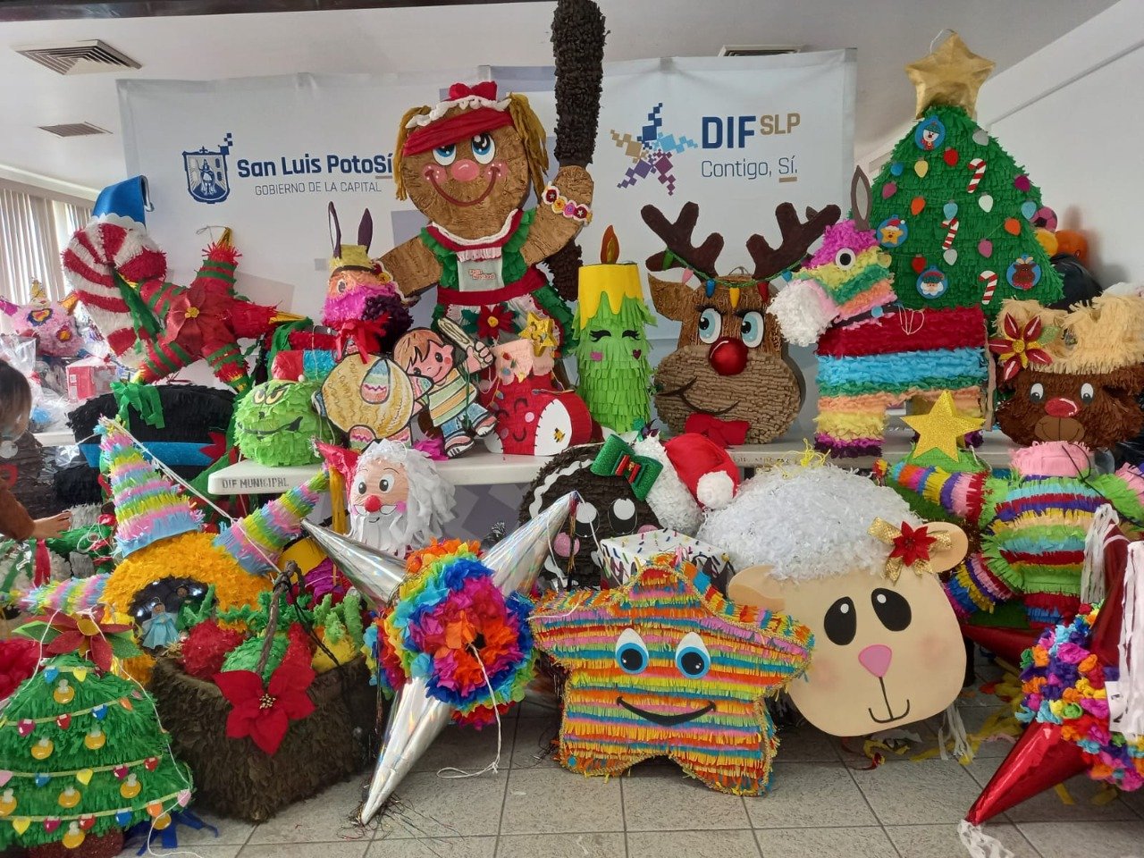 SLP.- Integrantes del Cabildo Capitalino apadrinaron los festejos navideños en los siete Centros Educativos del DIF Municipal, donde además fungieron como jurados en la premiación del concurso de elaboración de piñatas.