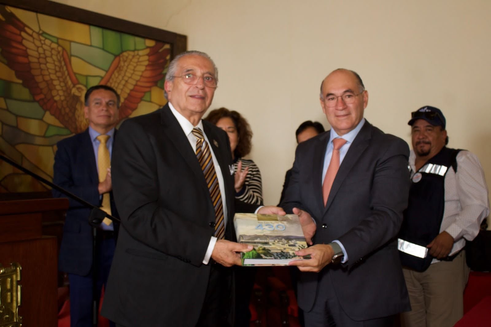 En presencia del Cabildo en pleno y de personalidades de distintos ámbitos, el Presidente Municipal Enrique Galindo Ceballos insistió en que el actual Gobierno Municipal mantiene la construcción de la Capital, a la par, festejarla también con toda una proyección internacional mediante una celebración completa que incluye la Presea al Mérito Cultural, la emisión del timbre postal en conmemoración del Aniversario 430 de San Luis Potosí y el libro especial que este día les fue entregado.