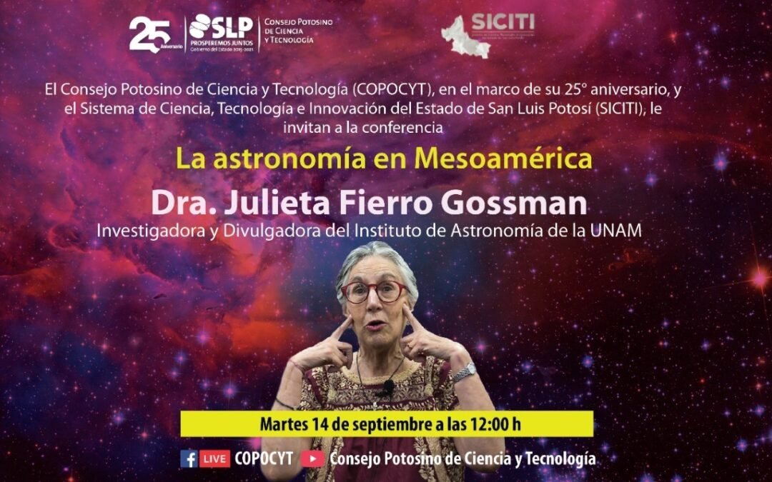 Con el objetivo de dar a conocer la evolución del conocimiento de los astros, y en el marco de su 25° aniversario, el Consejo Potosino de Ciencia y Tecnología (COPOCYT) invita a participar en la conferencia “La astronomía en Mesoamérica”, que se realizará este martes 14 de septiembre de 2021 a las 12:00 horas,.