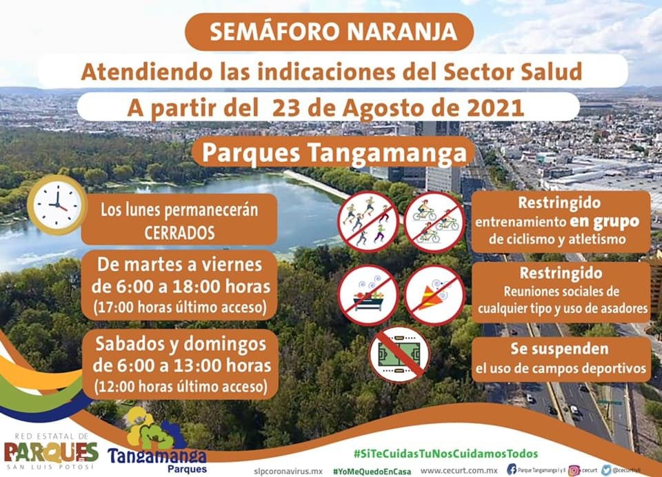 La Dirección General de los Centros Estatales de Cultura y Recreación Tangamanga, informó que, a partir del 23 de agosto, derivado del cambio a semáforo naranja y con el propósito de acatar las indicaciones del Sector Salud, los parques Tangamanga I y II, Azahares en Rioverde y Tantocob de Ciudad Valles, estarán abiertos de martes a viernes de 6 de la mañana a las 18:00 horas, con último acceso a las 17:00 de la tarde; sábados y domingos de 6:00 a 13:00 horas, con último acceso a las 12:00 horas; mientras que los lunes permanecerán cerrados.