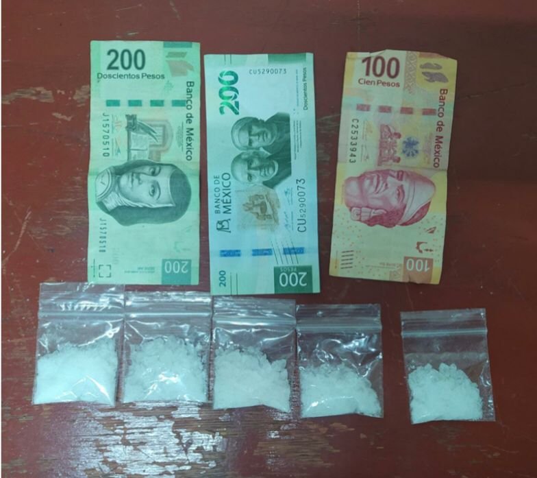 Al darle alcance, se le encuentra a Frank A. de 27 años de edad, 5 bolsitas plásticas en cuyo interior había al parecer “cristal” con un peso de 18.3 gramos, también quiso ofrecer la cantidad de 500 pesos a los policías a cambio de que lo dejaran ir.