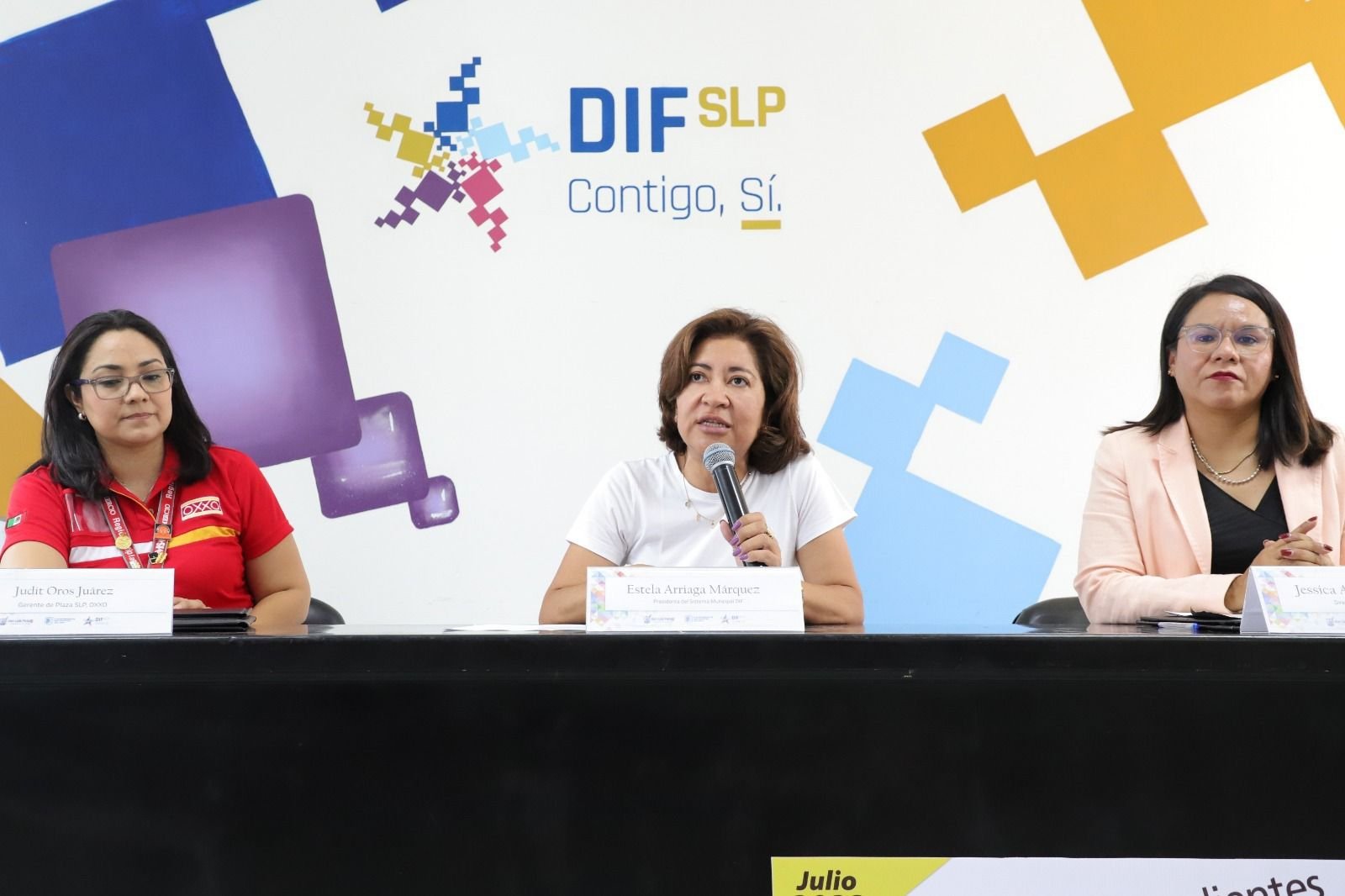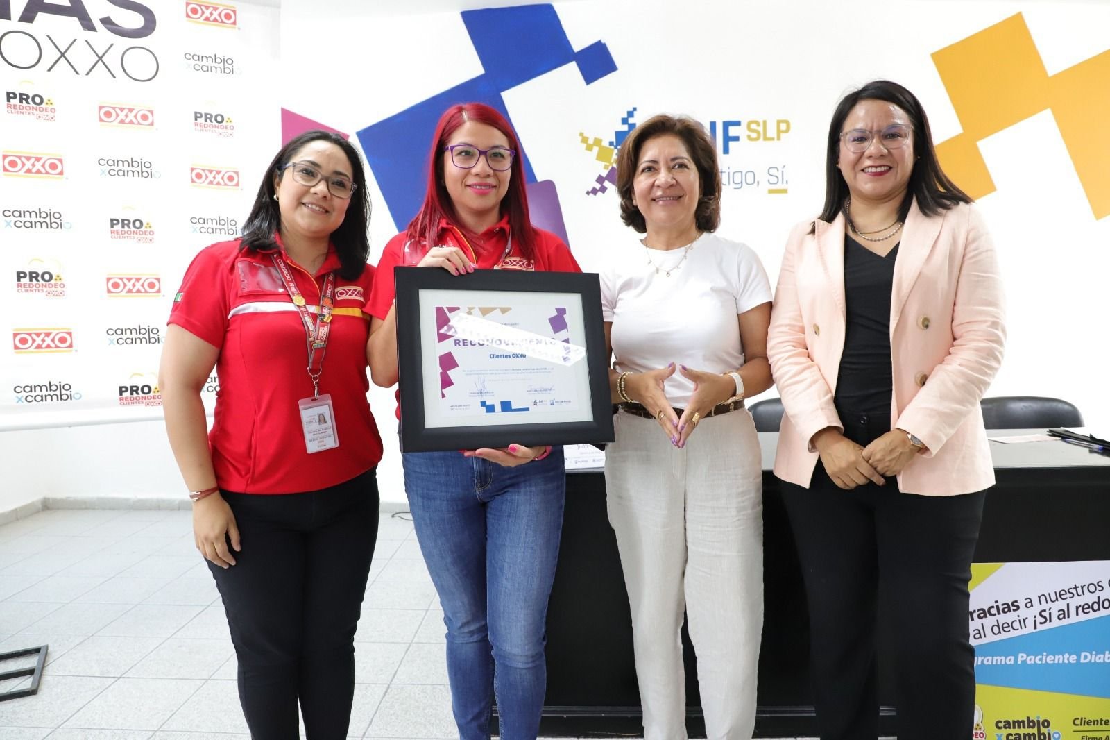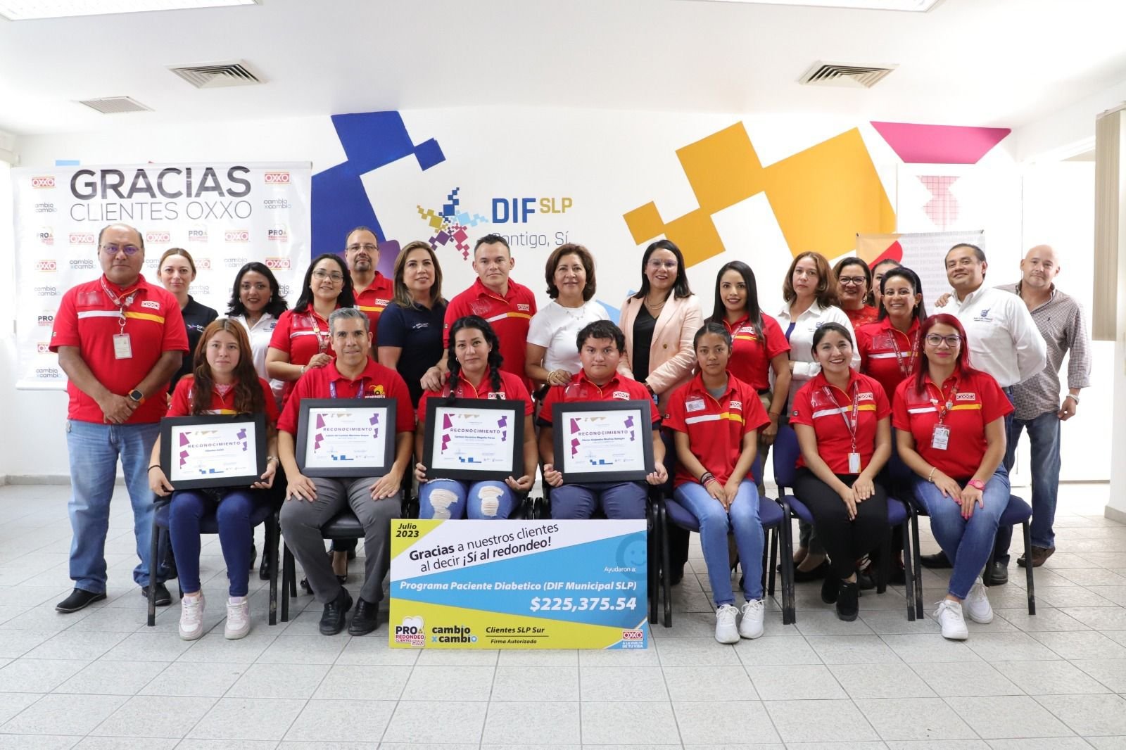 La Presidenta del DIF Municipal de San Luis Capital, Estela Arriaga Márquez, recibió de manos de Judith Oros Juárez, Gerente para San Luis Potosí Sur de la Cadena Comercial Oxxo, un cheque por más de 220 mil pesos correspondientes al donativo que se recaudó de enero a junio por medio del redondeo en la campaña ‘Promoviendo la salud en México, Cambio X Cambio’.