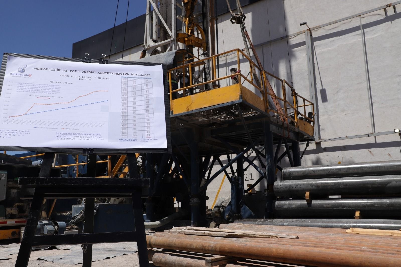 La perforación del pozo Posible II, en el espacio anexo a la Unidad Administrativa Municipal, lleva un avance del 81 por ciento, así lo constató el Alcalde de San Luis Potosí, Enrique Galindo Ceballos, en la supervisión que hizo de la que será una nueva fuente de abastecimiento de agua, como parte del Plan Emergente de Agua, que mitigará los efectos de la escasez en la zona sur de la ciudad.