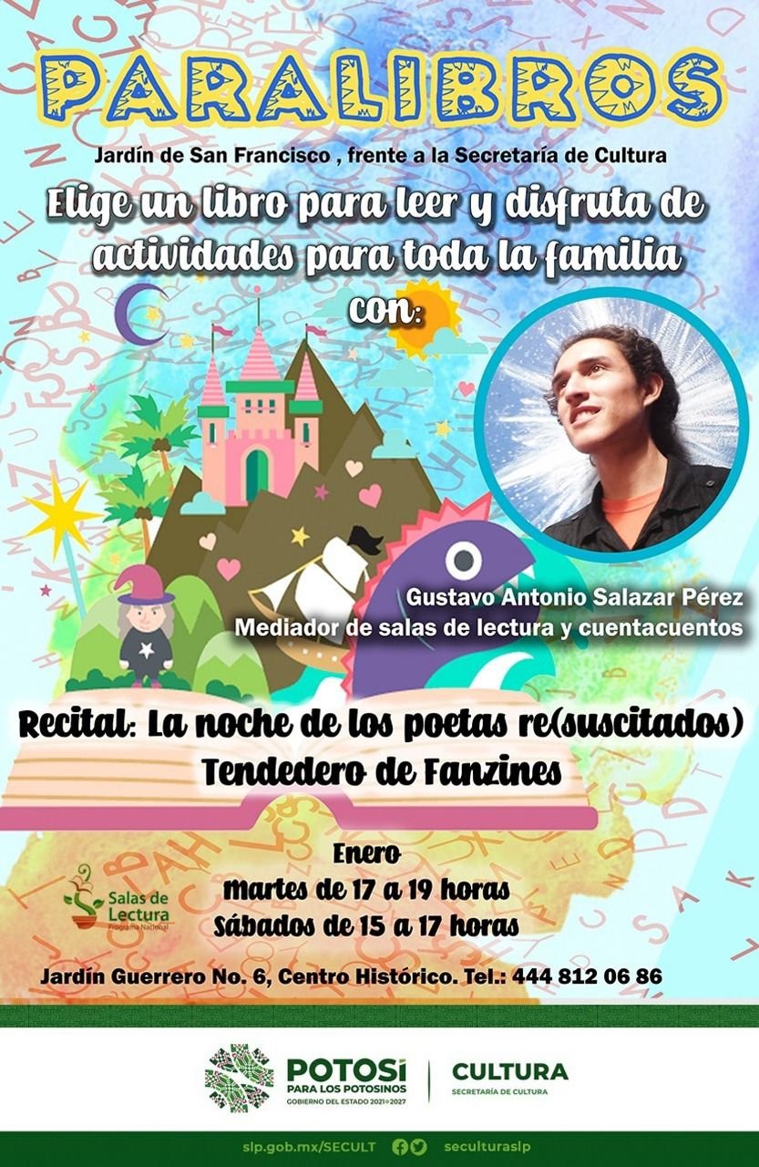 Para fomentar la lectura entre la población, el Paralibros ubicado en el Jardín Guerrero, estará Gustavo Antonio Salazar Pérez, mediador de salas de lectura y cuentacuentos para presentar el recital “La noche de los poetas re (suscitados). Tendedero de Fanzines”, este sábado 22 de enero de 15:00 a 17:00 horas, en un evento sin costo.