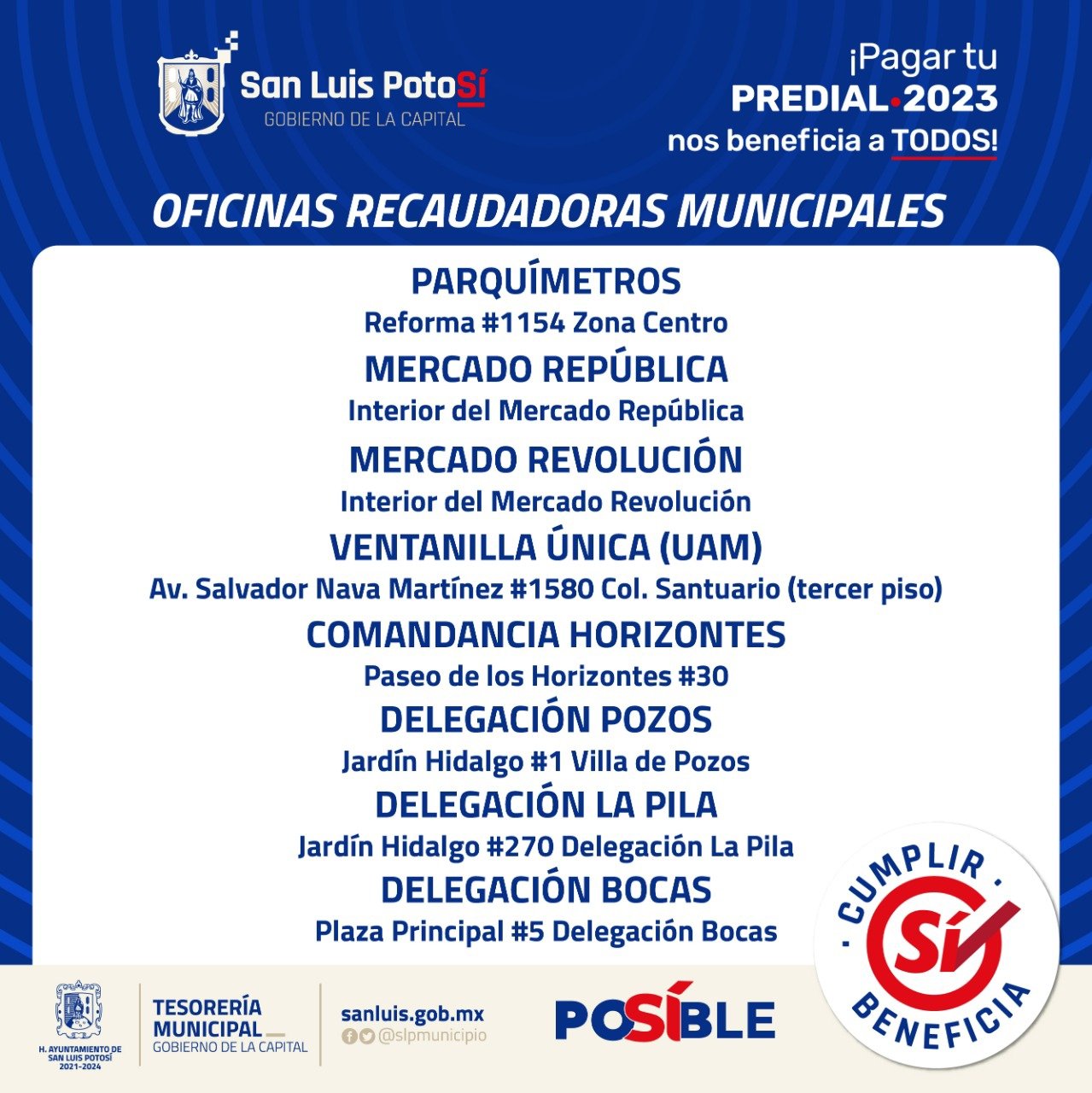 Asimismo, la Tesorería Municipal recordó que el pago puede realizarse en las 15 oficinas recaudadoras ubicadas en: la Unidad Administrativa Municipal y en la Ventanilla Única en estas mismas instalaciones; avenida Ferrocarril, Plaza Gemelos, Zenón Fernández, Palacio Municipal, oficinas de Parquímetros, Cementerio del Saucito, Mercado República, Centro Unión, Mercado Revolución, en las oficinas municipales de Horizontes, así como en las localizadas en las tres delegaciones Bocas, La Pila y Villa de Pozos.