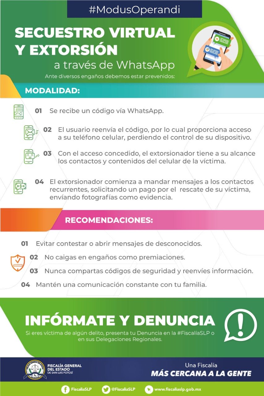 • La Fiscalía General del Estado (FGE) alerta a la ciudadanía sobre diversos tipos de extorsión telefónica reportados en las últimos días en el Estado de San Luis Potosí.