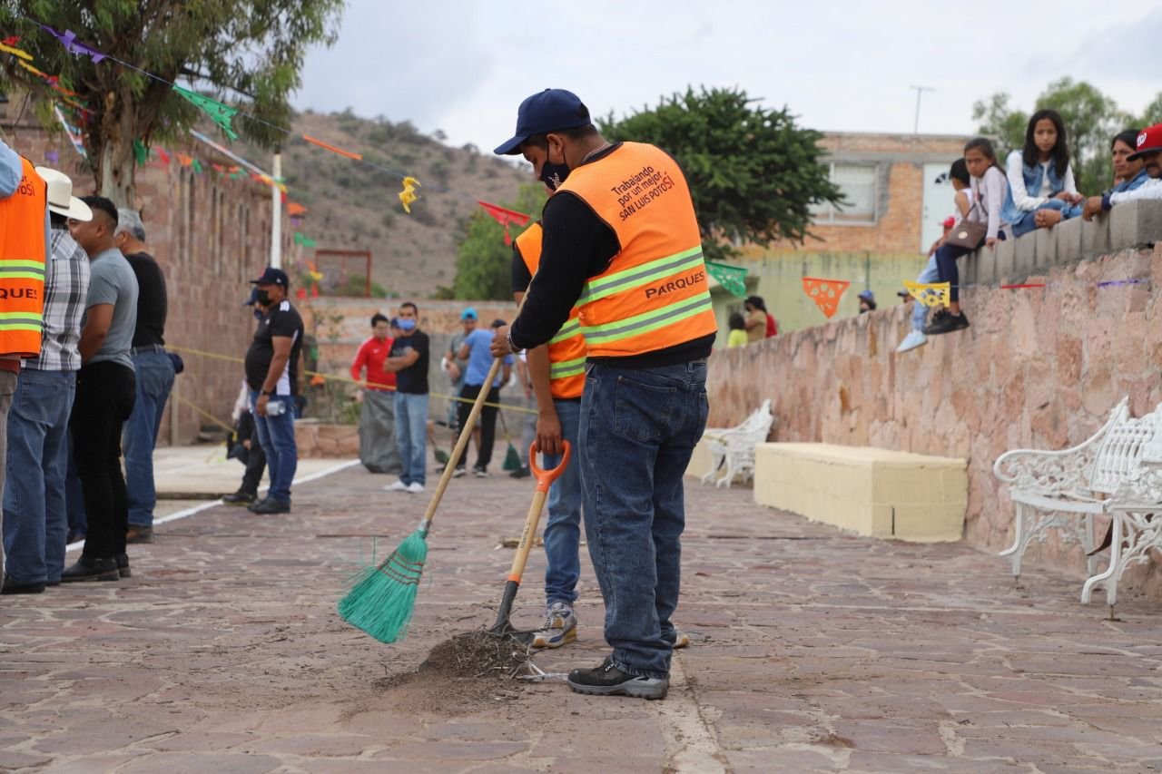 El trabajo en el que participaron las y los trabajadores del Ayuntamiento empezó con el remozamiento de la explanada del templo, le siguió la rehabilitación de la cancha de futbol, con arreglos en el piso y en el equipamiento de las instalaciones.