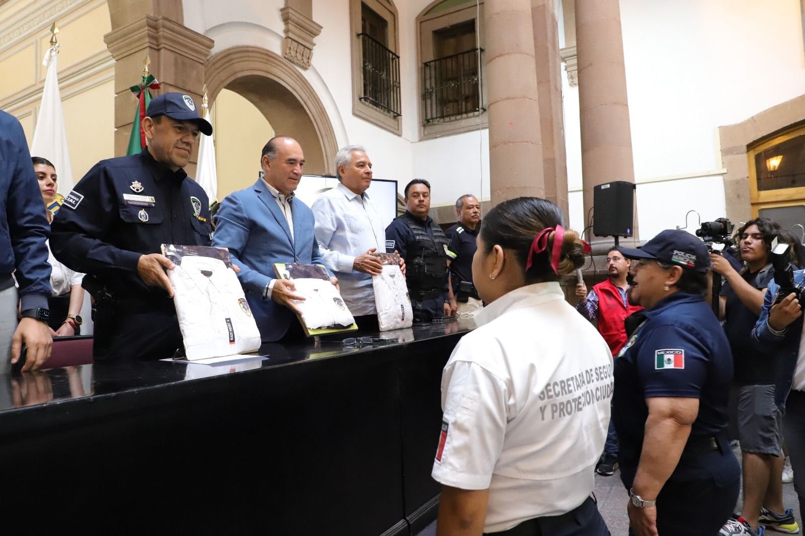 - El Presidente Municipal reconoce la labor extraordinaria que hacen todos los días hombres y mujeres para construir la paz en la ciudad; 1346 policías recibieron equipamiento.