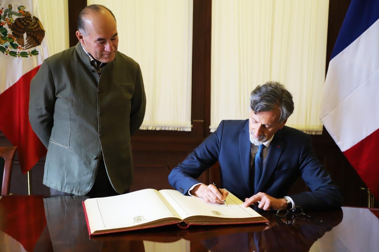 El alcalde Enrique Galindo y el embajador Jean-Pierre Azvazadourian visitaron el Salón de Cabildos y el despacho del presidente municipal. Después, en un salón adjunto, el diplomático francés firmó el Libro de Visitantes Distinguidos.