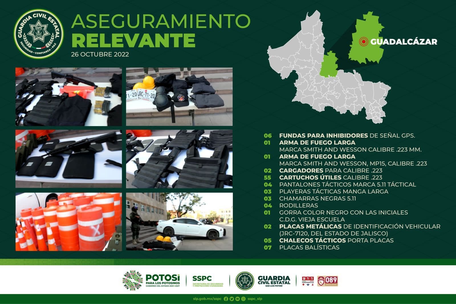 Esta relevante acción por parte de la Guardia Civil Estatal deriva del reforzamiento que la Secretaría de Seguridad y Protección Ciudadana del Estado (SSPCE) implementa en esta zona territorial, con la finalidad de disuadir otros hechos delictivos como el robo a autotransporte de carga en la carretera a Matehuala, luego del reporte de estas incidencias. La dependencia exhorta a la ciudadanía a ser colaborativa en la prevención y combate de cualquier acto con apariencia de delito, denunciando al Sistema de Emergencias 911 y de Denuncia Anónima 089.
