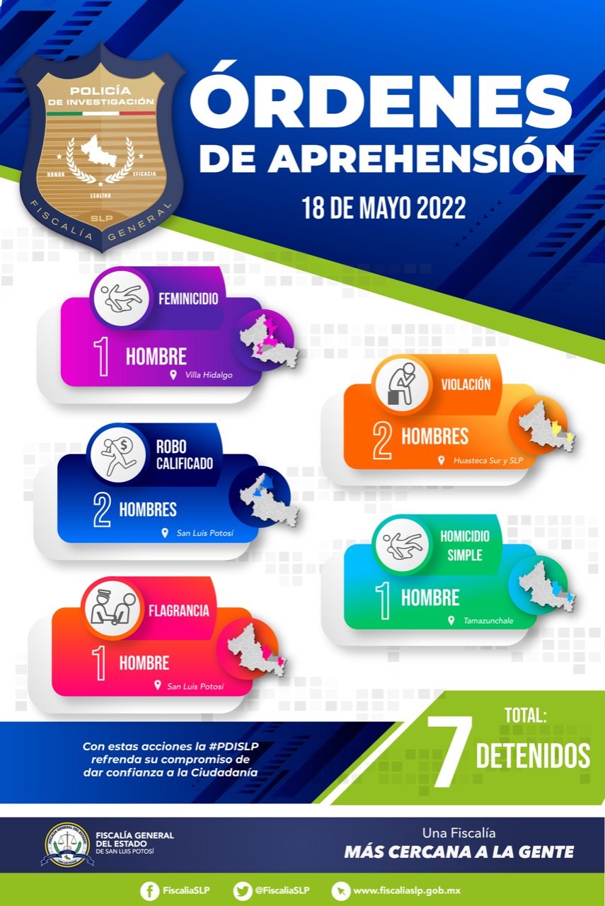 SLP. – La Fiscalía General del Estado (FGE) detuvo a siete personas relacionadas con varios delitos en San Luis Potosí, durante las últimas horas.