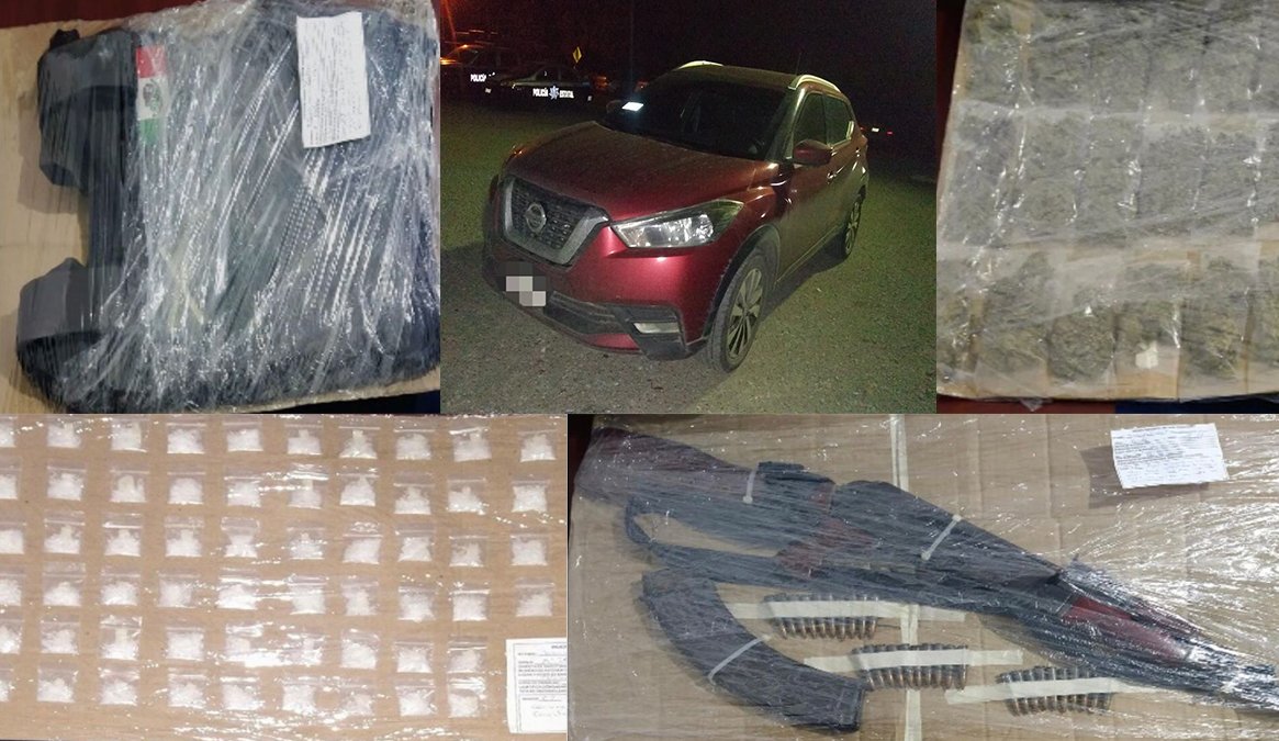 Al realizar una inspección en la unidad se localizó lo siguiente: 01 arma de fuego larga, tipo fusil de asalto, calibre 7.62 × 39, en color pavón negro con un cargador abastecido con 30 cartuchos útiles del mismo calibre, una caja de cartón en cuyo interior había 45 bolsas de nylon transparentes conteniendo marihuana con un peso total de 566 gramos y 66 bolsas tipo ziploc de nylon transparentes conteniendo la droga sintética granulada conocida como “cristal” con un peso total de 38.8 gramos así como 01 chaleco táctico en color negro.