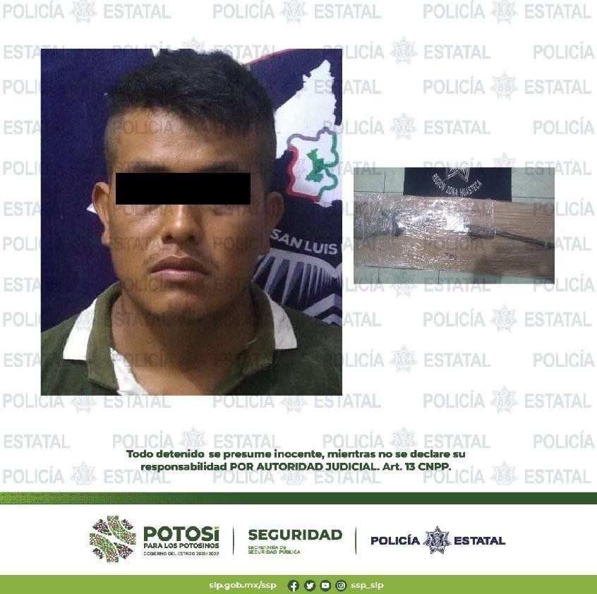 Derivado de un reporte a la Línea de Emergencia 9-1-1, Policías Estatales adscritos a la región Huasteca en Tanlajás, S.L.P., detuvieron a Gabriel H., de 25 años de edad, después de que se le asegurara un arma de fuego, tipo escopeta, así como un cartucho útil y una motocicleta marca Italika Z125, color negro con rojo, modelo 2021, en la cual se desplazaba.