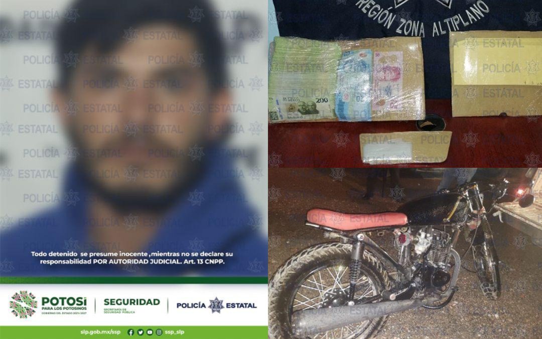 Víctor “N” de 29 años de edad se desplazaba en una motocicleta sin placas de circulación y al ser detenido se le encontraron 28 sobres de papel bond en color amarillo con la leyenda escrita 2.5 que contenían 84, 250 pesos en moneda nacional.