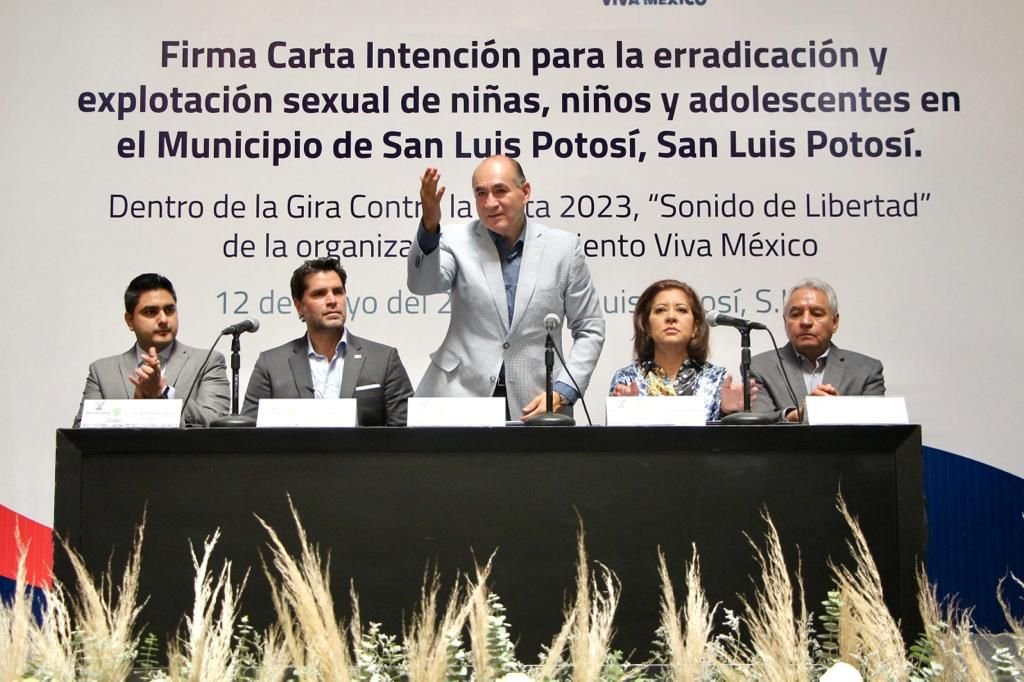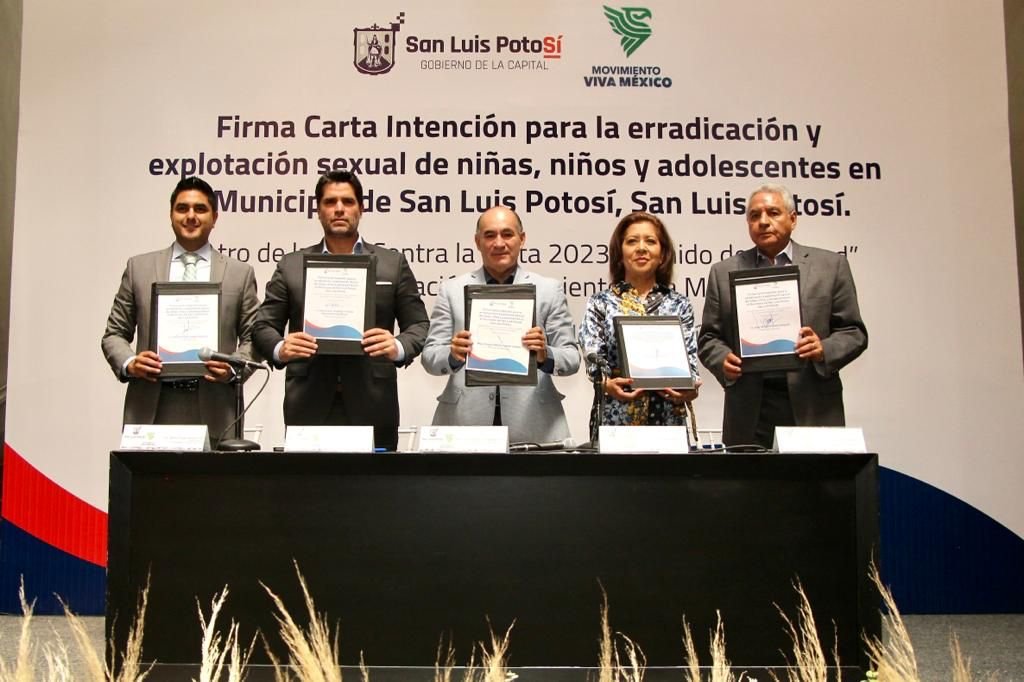 El Ayuntamiento de San Luis Potosí, a través del Presidente Municipal Enrique Galindo; y el Sistema Municipal DIF, representado por su Presidenta Estela Arriaga Márquez; firmaron este viernes la Carta Intención Contra la Trata 2023, con el Presidente Honorario de la organización Movimiento Viva México, Eduardo Verástegui.