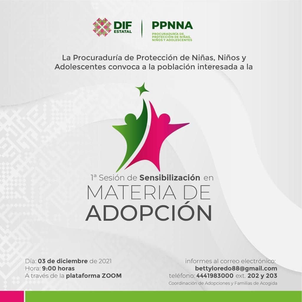 Cumpliendo la indicación del Gobernador de San Luis Potosí Ricardo Gallardo Cardona y de la presidenta del Sistema Estatal para el Desarrollo Integral de la Familia (DIF) Ruth González Silva, de garantizar el bienestar y protección en la infancia potosina, la Procuraduría de Protección de Niñas, Niños y Adolescentes (PPNNA) llevará a cabo una sesión de charlas de sensibilización en materia de adopción con el objetivo de concientizar a la ciudadanía sobre las implicaciones de ser padre y madre adoptivos.