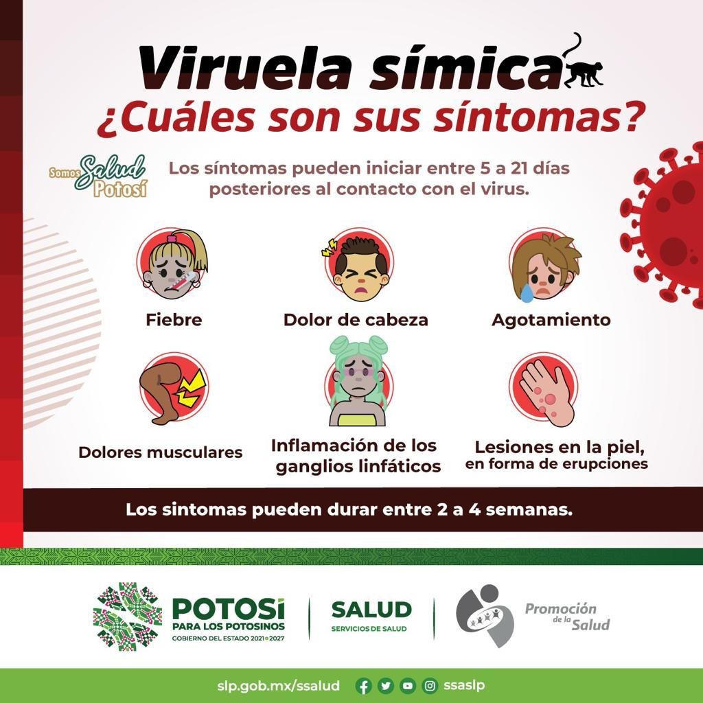 El médico recordó que los síntomas de la viruela símica son fiebre, dolor de cabeza, dolores musculares, de garganta, tos, escalofríos y agotamiento, pero de acuerdo con los Centros para el Control y la Prevención de las Enfermedades (CDC), se caracteriza por el desarrollo de inflamación de ganglios linfáticos y erupciones en la piel, que aparecen en la cara y cuerpo, incluyendo la zona genital.