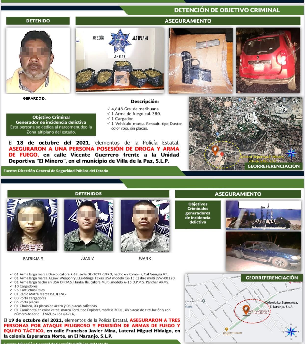 Los casos de mayor relevancia van desde el desmantelamiento de un mini c3 que operaba un grupo criminal en Ciudad Valles hasta la desarticulación de células delictivas generadoras de violencia en Ciudad Valles, Matehuala, Villa de la Paz, Cerritos, Ciudad del Maíz, El Naranjo, Mexquitic de Carmona, San Vicente Tancuayalab y Soledad de Graciano Sánchez.