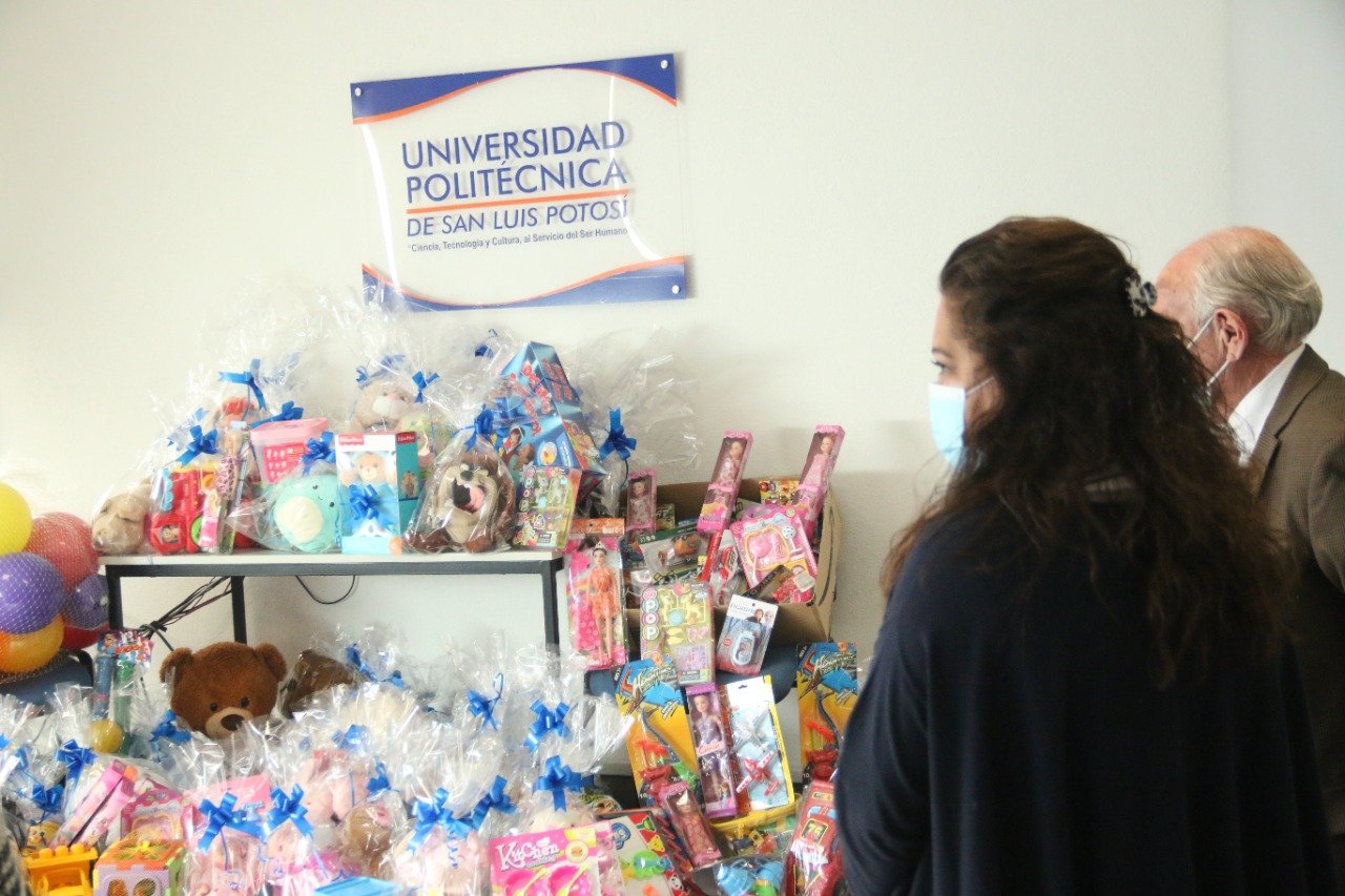SLP.- La presidenta del Sistema Municipal para el Desarrollo Integral de la Familia (SMDIF), Estela Arriaga Márquez, recibió de parte del voluntariado de la Universidad Politécnica de San Luis Potosí la donación de 200 juguetes para regalar a pequeños de escasos recursos.